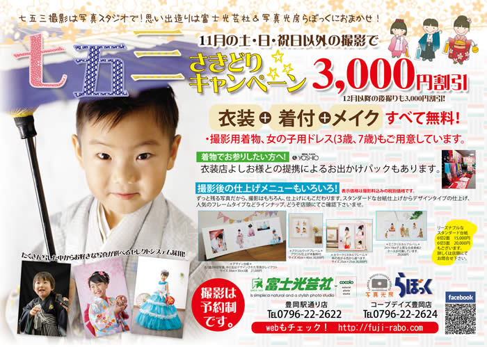 今年の富士光芸社・写真光房らぼっくの七五三は、去年大変好評でした、シーズンオフキャンペーンを今年もおこないます!